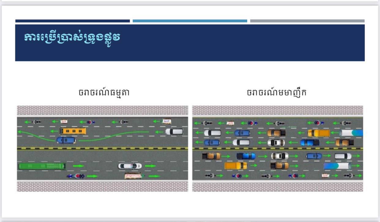 ជាមួយគ្នានេះ បើយោងតាមមាត្រា៩ នៃច្បាប់ស្តីចរាចរណ៍ផ្លូវគោក និងវិសោធនកម្ម មានខ្លឹមសារថា៖ នៅលើទ្រូងផ្លូវដែលមានទិសចរាចរណ៍ពីរ ហើយដែលគ្មានគំនូសសញ្ញាបែងចែកទិសចរាចរណ៍ អ្នកបើកបរត្រូវប្រើប្រាស់ពាក់កណ្តាលទ្រូងផ្លូវផ្នែកខាងស្តាំ ដោយបើកបរកៀកទៅខាងស្តាំ។