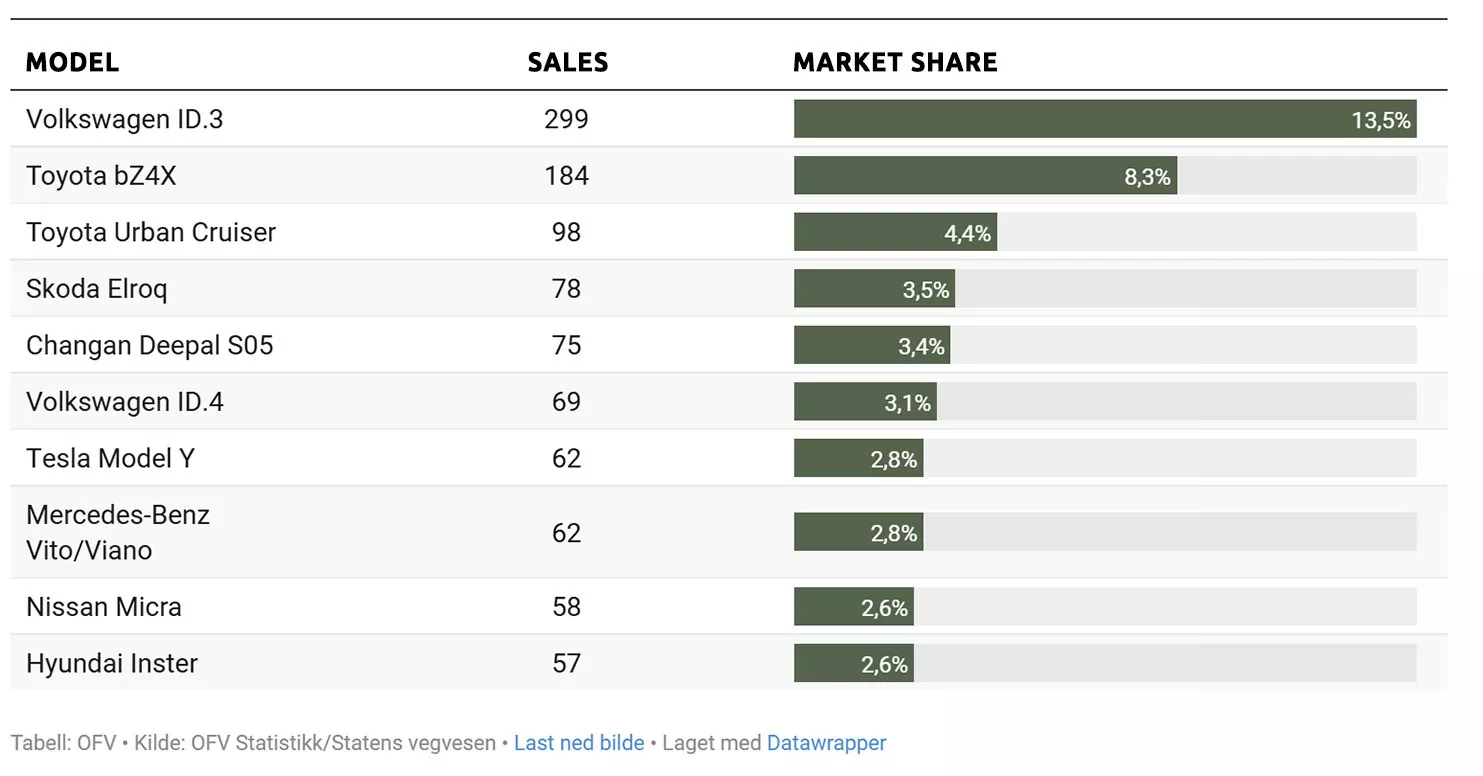 បច្ចុប្បន្ននេះ រថយន្តអគ្គិសនីជាច្រើនម៉ូឌែលផ្សេងទៀត កំពុងតែដណ្ដើមបានចំនួនលក់លើសពី Model Y យ៉ាងច្រើននៅក្នុងប្រទេសន័រវែស។ ក្នុងនោះម៉ូឌែលនាំមុខគេក្នុងការលក់នៅខែមករាគឺរថយន្ដ Volkswagen ID.3 លក់បានរហូតដល់ចំនួន ២៩៩ គ្រឿង ពោលគឺច្រើនជាងរថយន្ត Tesla ជិត ៥ ដង។ ចំណែករថយន្ត Toyota bZ4X តាមពីក្រោយស្ថិតក្នុងចំណាត់ថ្នាក់ទី២ ដោយលក់បានចំនួន ១៨៤ គ្រឿង ខណៈថយន្ត Toyota Urban Cruiser ឈរនៅលេខ៣ លក់បានចំនួនន ៩៨ គ្រឿង ។