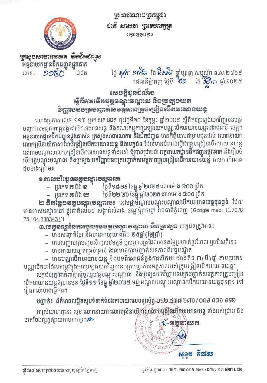 អគ្គនាយកដ្ឋានដឹកជញ្ជូនផ្លូវគោក នៃក្រសួងសាធារណការ និងដឹកជញ្ជូនផ្លូវគោក នឹងរៀបចំបើកវគ្គបណ្តុះបណ្តាល និងប្រឡងយកវិញ្ញាបនបត្របញ្ជាក់សមត្ថភាពគ្រូបង្រៀនបើកបរយានយន្ត។