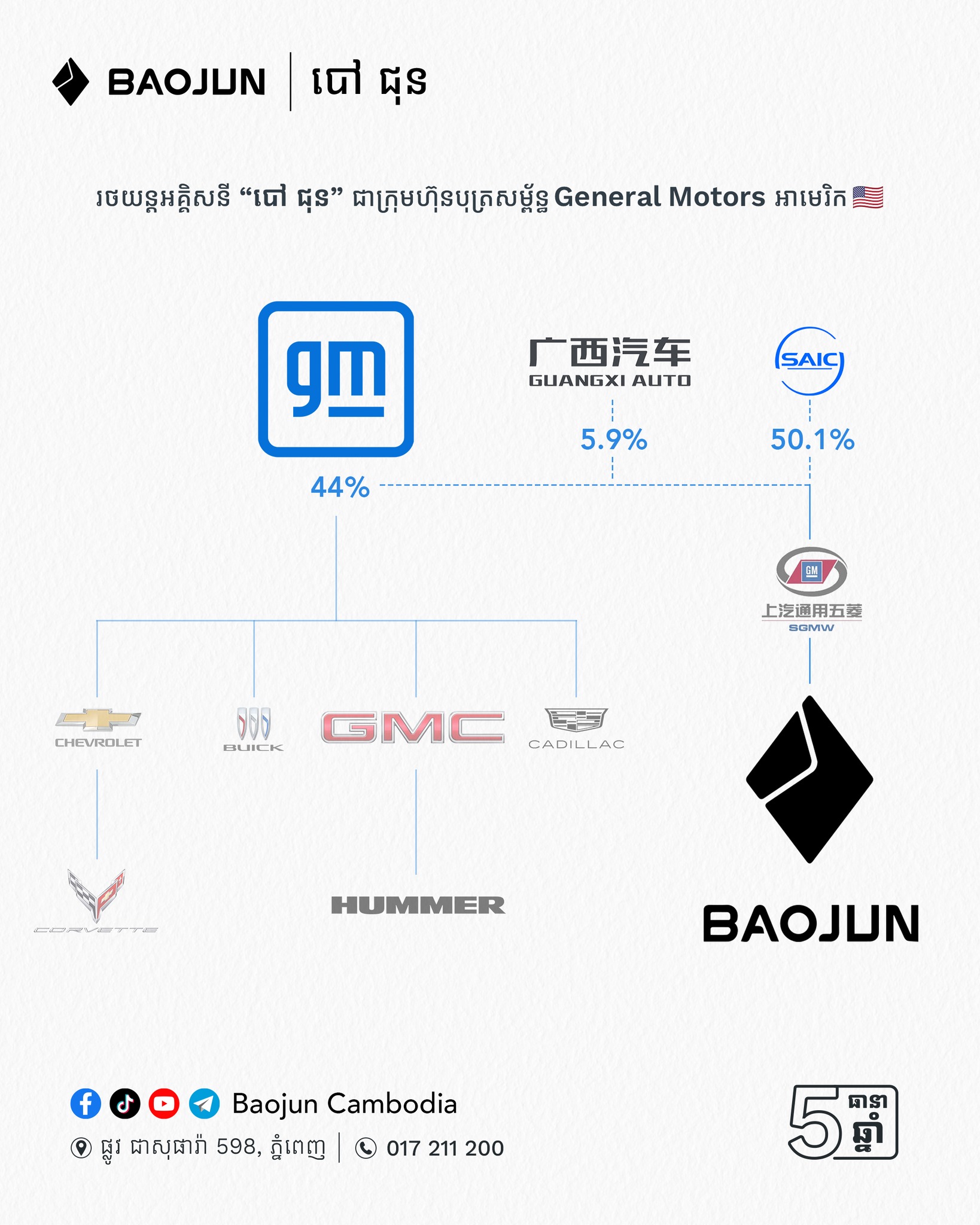 សម្រាប់ Baojun ជាម៉ាករថយន្តអគ្គិសនី របស់ក្រុមហ៊ុនមេ SGMW ដែលមាននភាគហ៊ុនធំ 50.1% កាន់កាប់ដោយ SAIC និង 44% កាន់កាប់ដោយ GM សហរដ្ឋអាមេរិក 🇺🇸 ឯ 5.9% ទៀត កាន់កាប់ដោយ Guangxi Automobile Group សហគ្រាសផលិតរថយន្តដែលគ្រប់គ្រងដោយរដ្ឋ ដូច្នេះជាហេតុធ្វើឲ្យរថយន្ដ Baojun ត្រូវអាចហៅរថយន្តអគ្គិសនីកូនកាត់អាមេរិក។