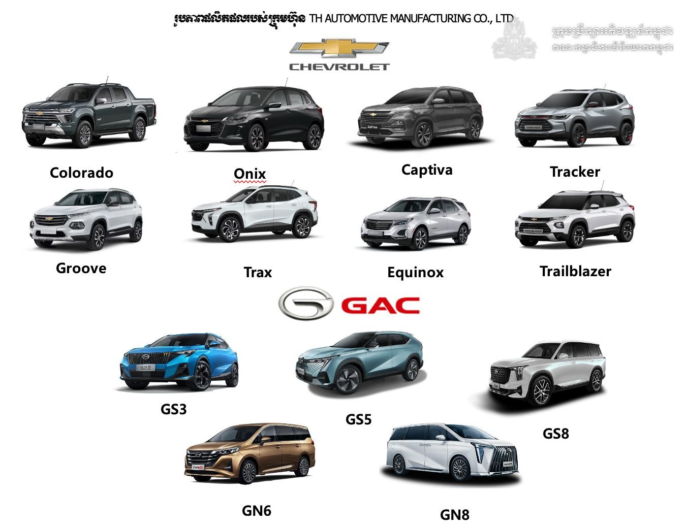 - CHEVROLET: Colorado, Onix, Captiva, Tracker, Groove, Trax, Equinox និង Traiblazer។