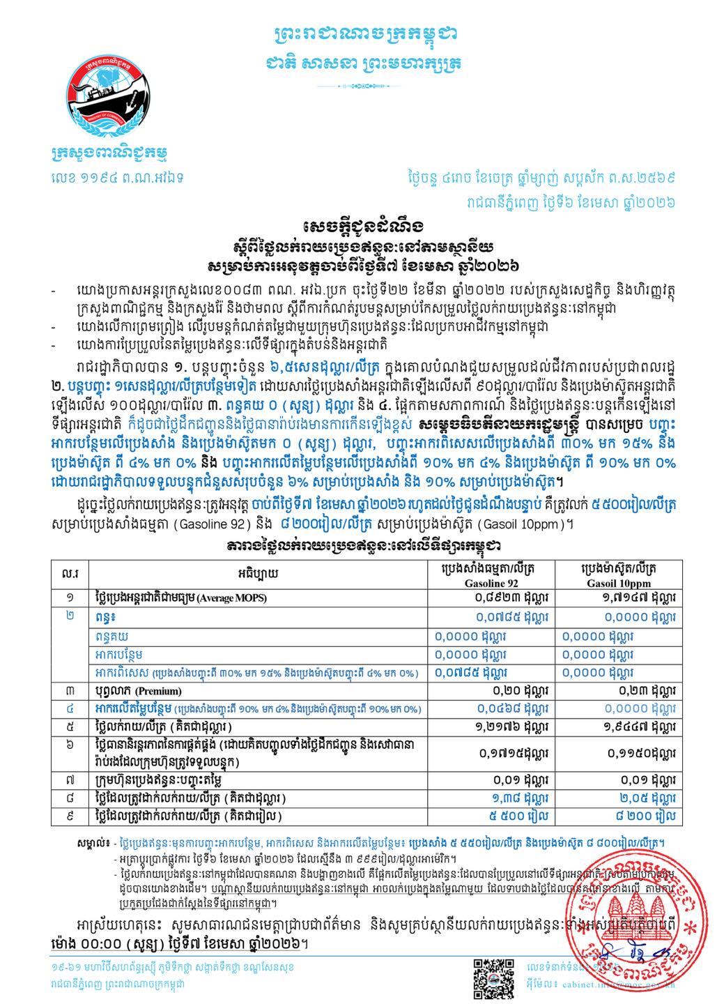 ចាប់តាំងពីថ្ងៃទី១ ខែមេសា ឆ្នាំ២០២៦មក រាជរដ្ឋាភិបាលកម្ពុជា បានដាក់ចេញវិធានការបន្ថែមទៀត ដើម្បីសម្រួលដល់ការចំណាយរបស់ប្រជាពលរដ្ឋ ទៅលើប្រេងម៉ាស៊ូត និងឧស្ម័ន LPG ដោយបានសម្រេចទទួលបន្ទុកបង់អាករលើបន្ថែមជំនួស ១០% ទាំងស្រុងតែម្តង។