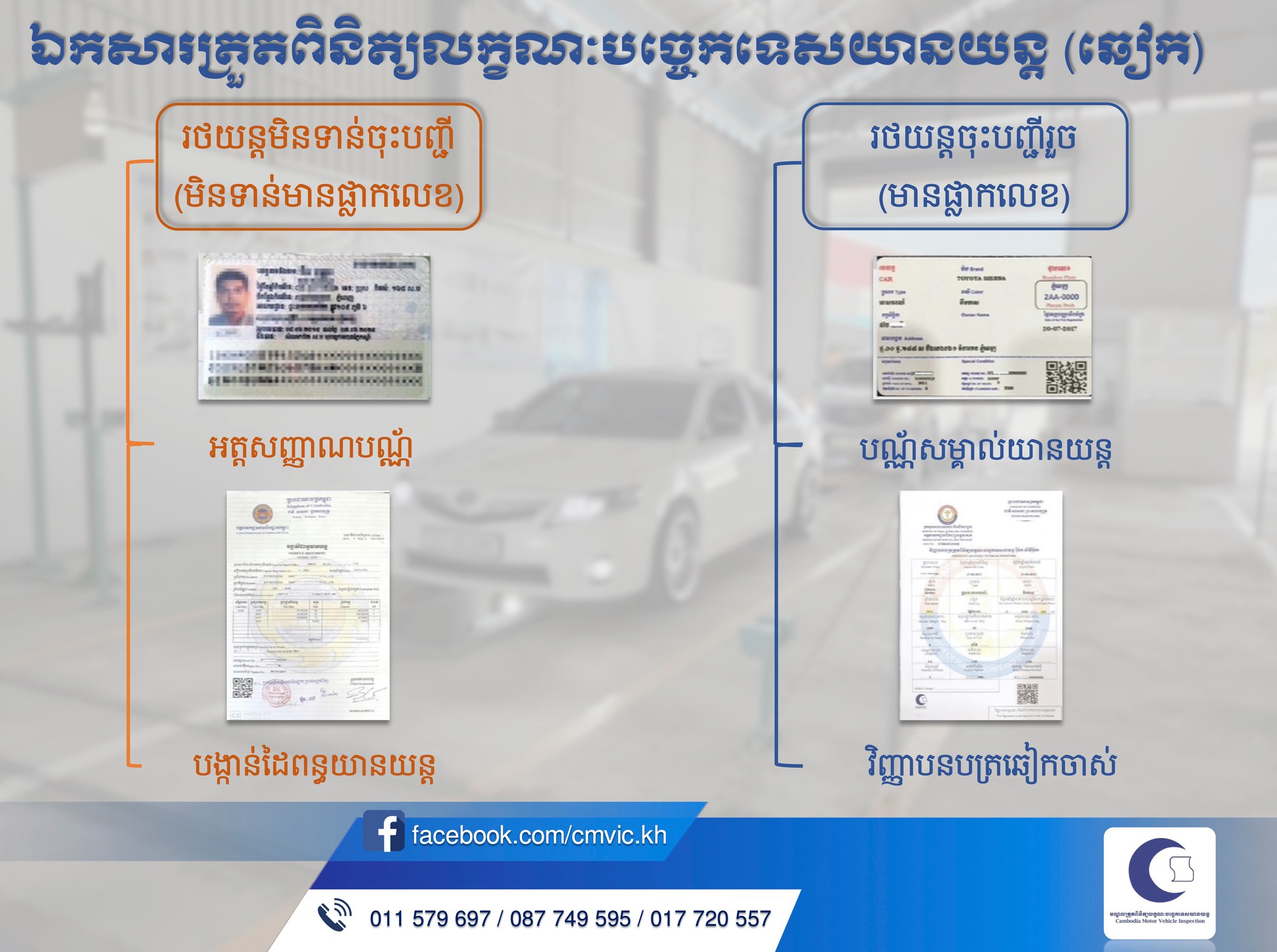 ១. សម្រាប់យានយន្តចុះបញ្ជីរួច (មានផ្លាកលេខ) គឺត្រូវមានប័ណ្ណសម្គាល់យានយន្ត ឬ កាតគ្រី និងវិញ្ញាបនបត្រឆៀកចាស់ ឬលតាបត្របិទជាប់កញ្ចក់យានយន្ត។