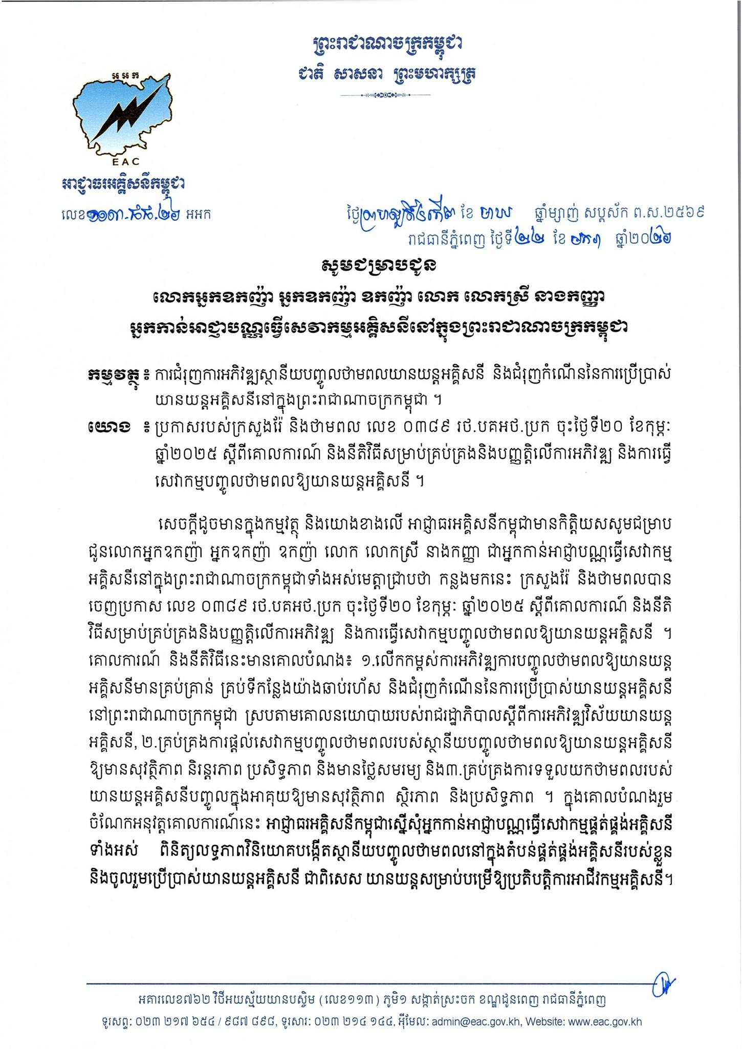 តាមរយៈលិខិតនេះ គឺអាជ្ញាធរអគ្គិសនីកម្ពុជា បានជំរុញឲ្យអ្នកកាន់អាជ្ញាបណ្ណធ្វើសេវាកម្មអគ្គិសនីទាំងអស់នៅកម្ពុជា ពិនិត្យលទ្ធភាពវិនិយោគបង្កើតស្ថានីយបញ្ចូលថាមពលយានយន្តអគ្គិសនី នៅក្នុងតំបន់ផ្គត់ផ្គង់អគ្គិសនីរបស់ខ្លួន និងចូលរួមប្រើប្រាស់យានយន្តអគ្គិសនី ជាពិសេស យានយន្តសម្រាប់បម្រើឲ្យប្រតិបត្តិការអាជីវកម្មអគ្គិសនី។